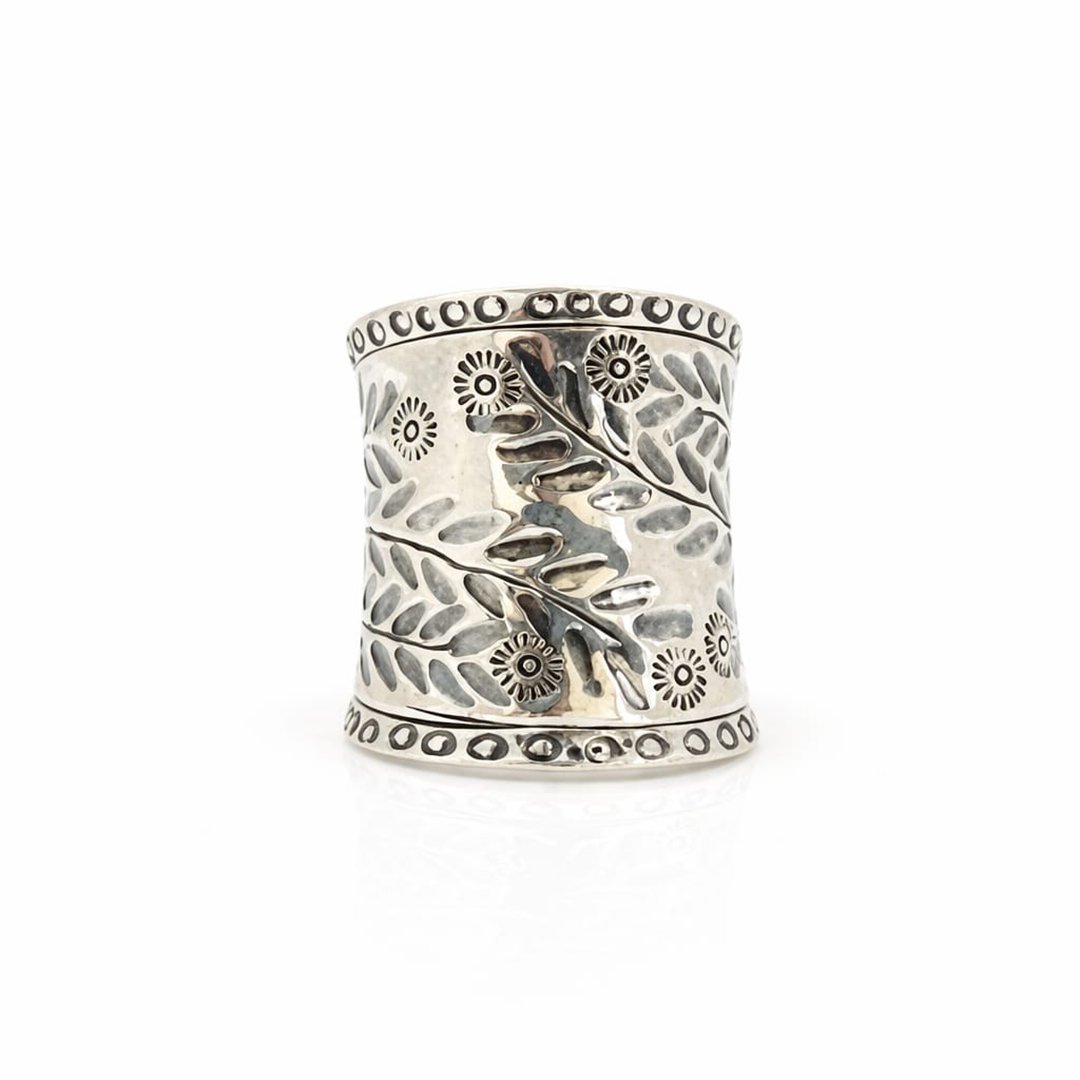 Anel confeccionado em Prata 925, modelo com Flores e acabamento oxidado.