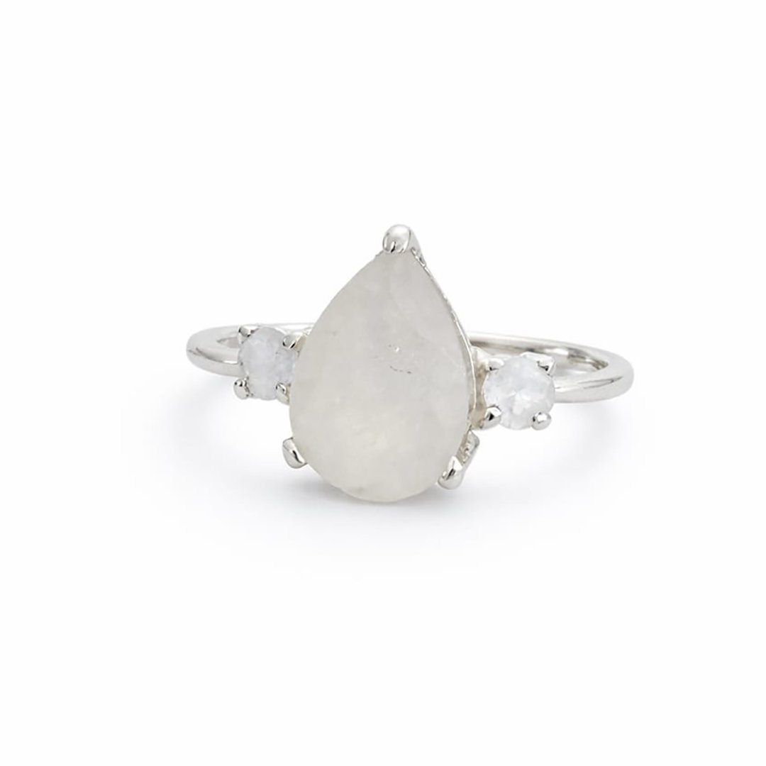 Anel confeccionado em Prata 925, modelo com pedra natural de Pedra da Lua estilo gota, alta joalheria.