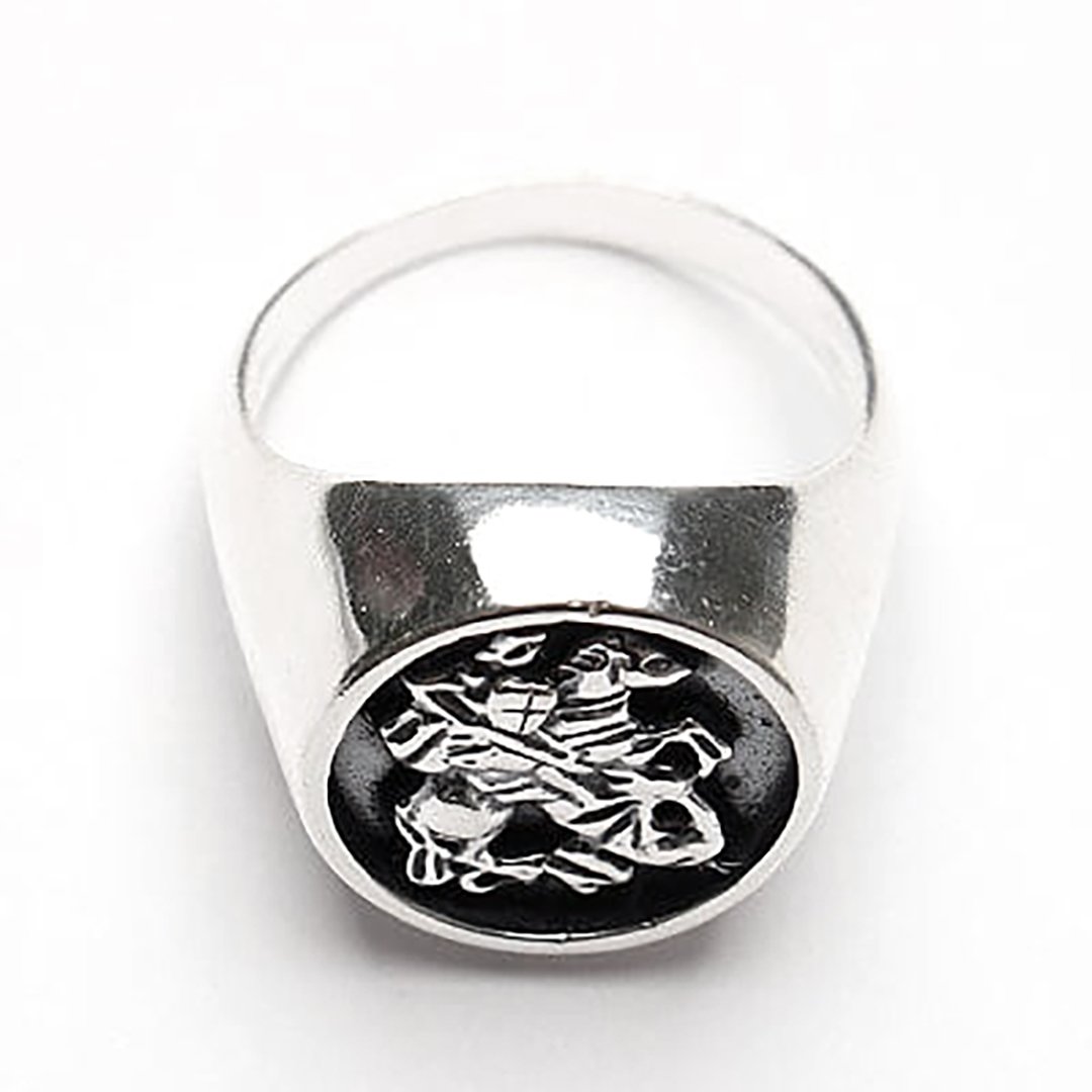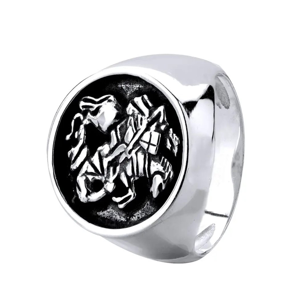 Anel confeccionado em Prata 925, modelo sinete com imagem de São Jorge, acabamento oxidado