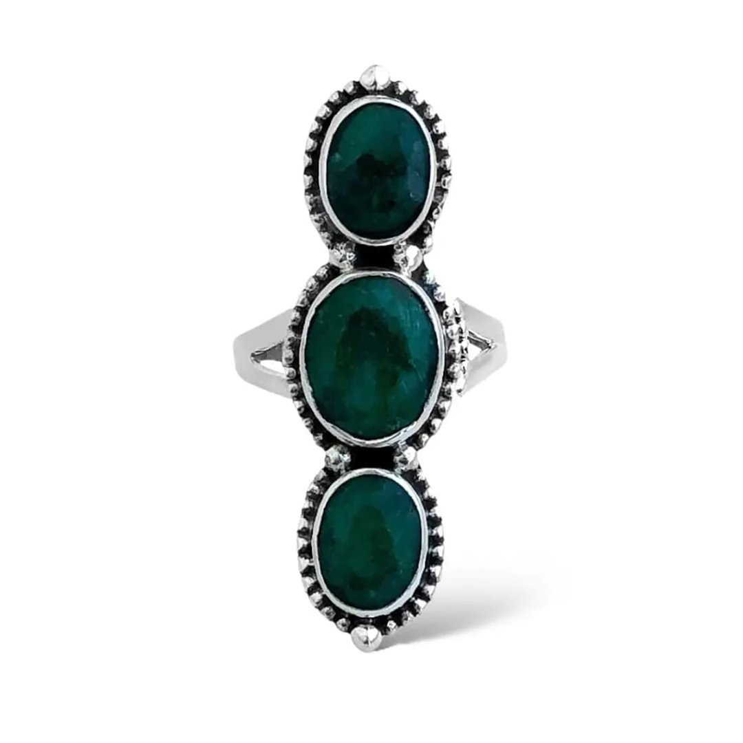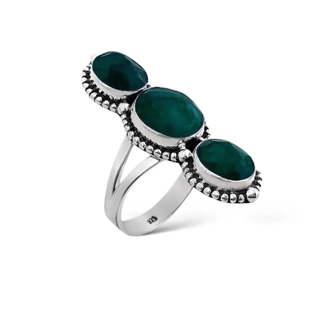 Anel confeccionado em Prata 925, modelo com três pedras naturais de esmeralda.