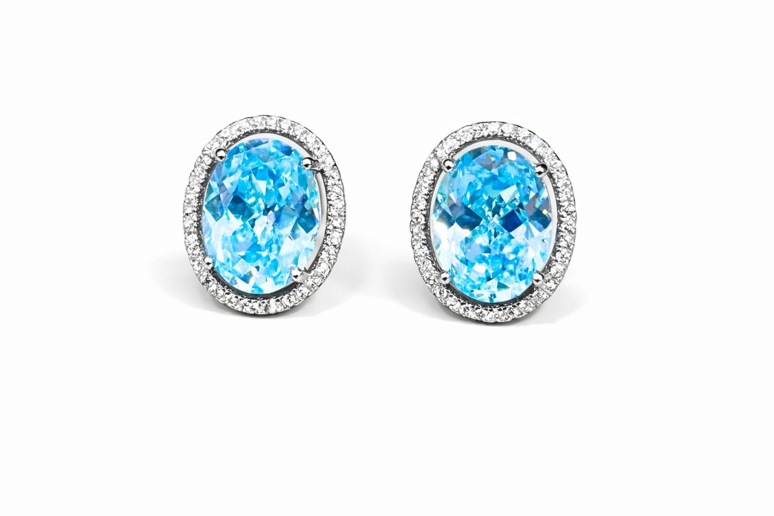 Brinco Prata 925, modelo Oval com Zircônia 5A cor Água Marinha, com acabamento em cravação. Pino e tarraxa central