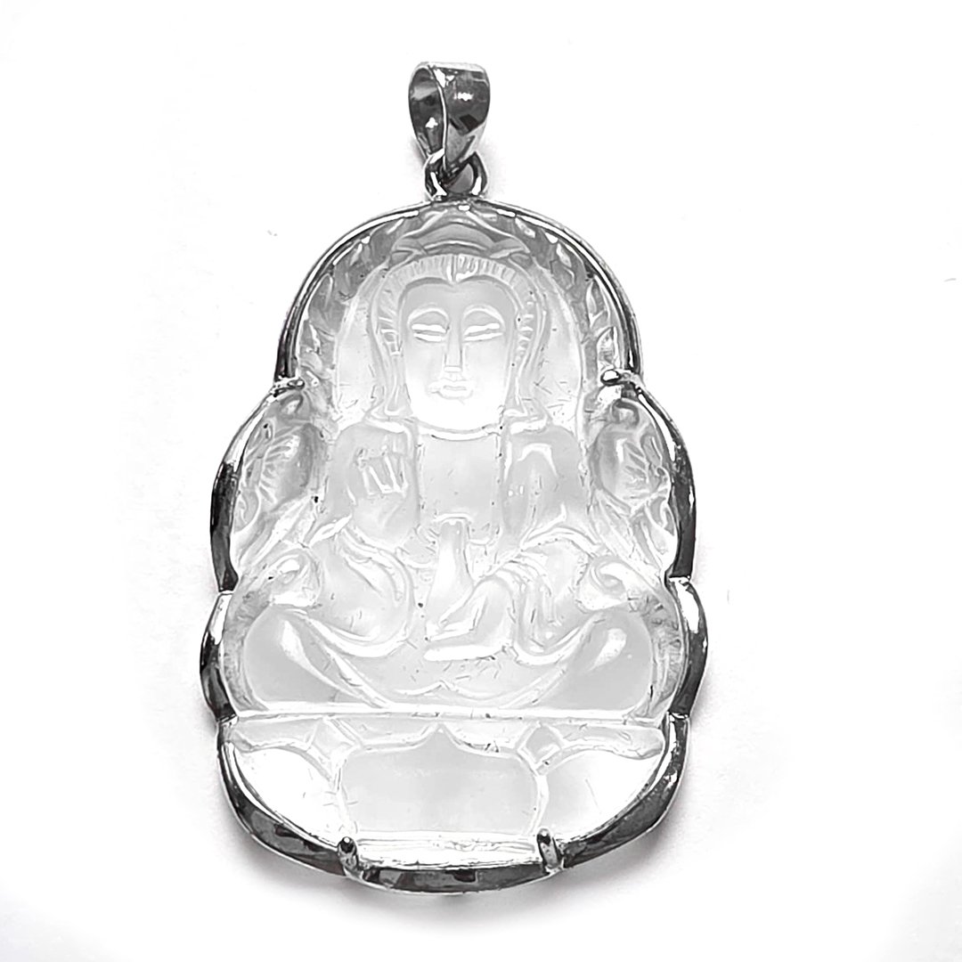 Pingente confeccionado em Prata 925, Buda em Quartzo Cristal, cravação em garras.