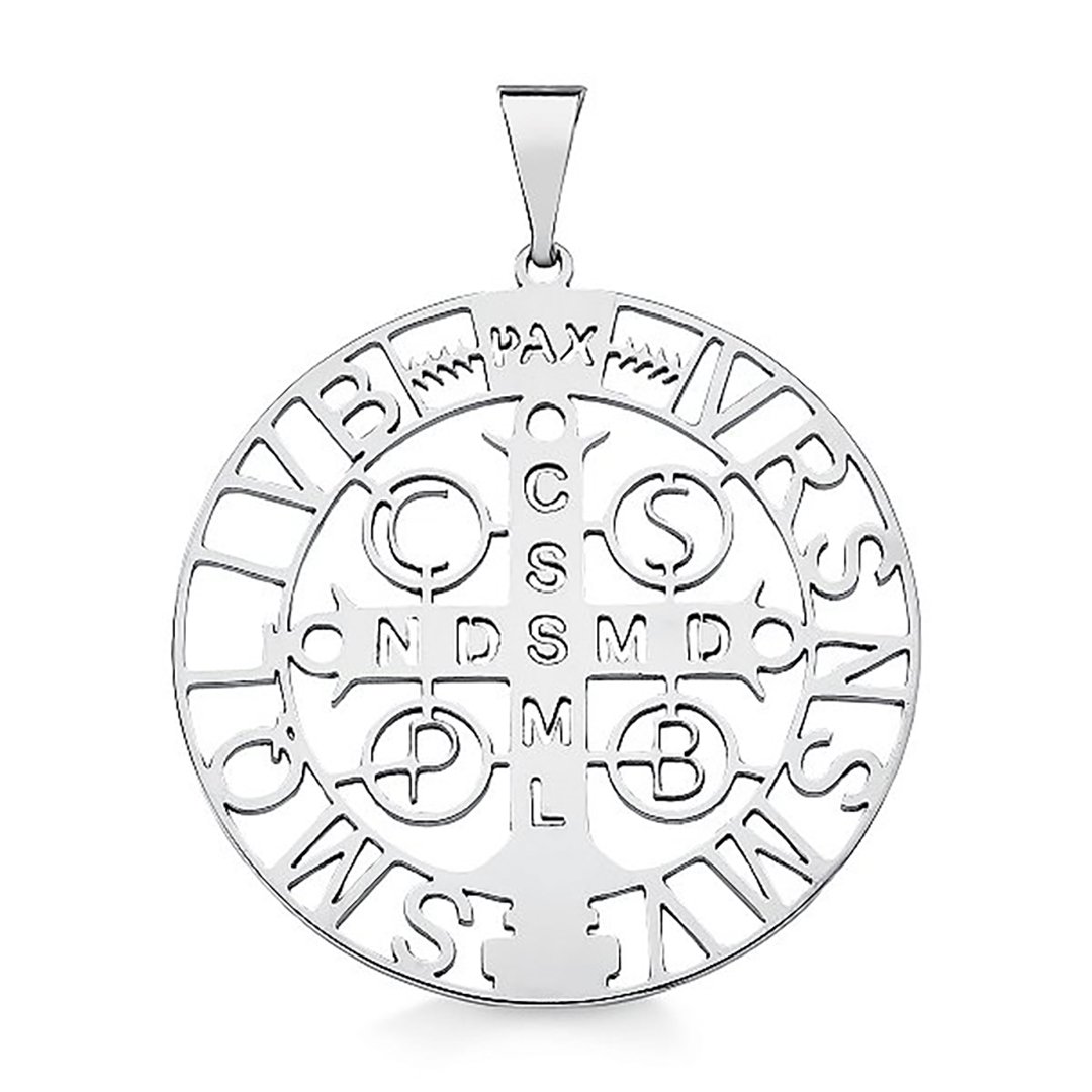 Pingente confeccionado em Prata 925, modelo medalha de São Bento vazado, com acabamento oxidado