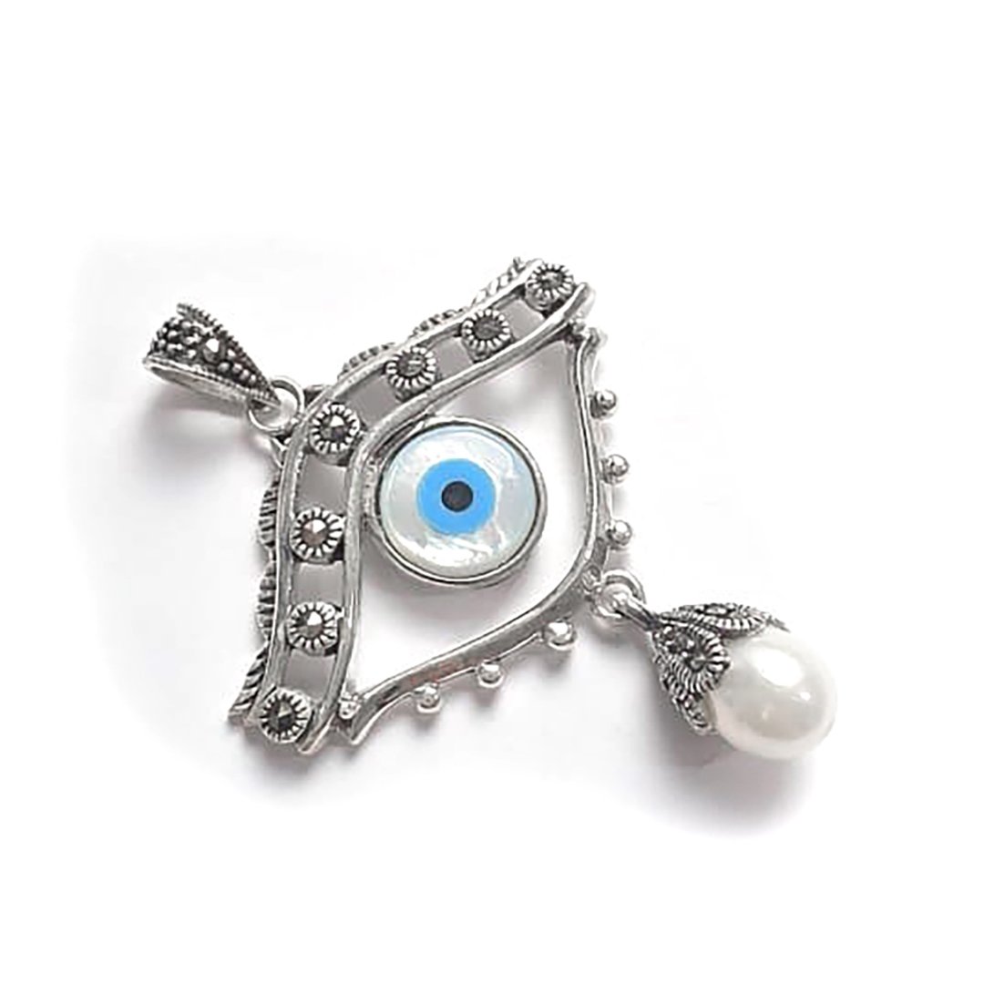 Pingente confeccionado em Prata 925, modelo olho grego em Madrepérola, Marcassita Suíça, Pérola, acabamento oxidado