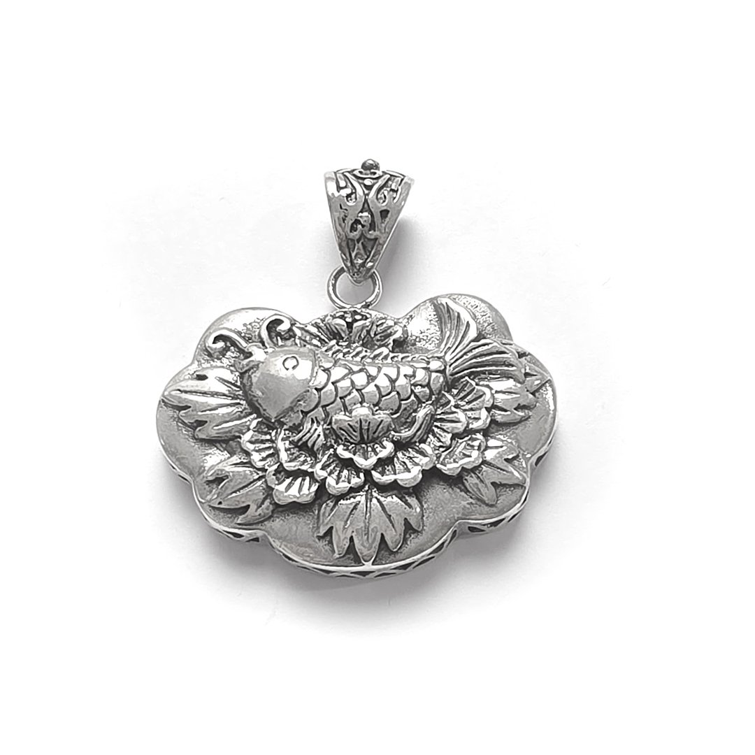 Pingente confeccionado em Prata 925, Tailandês,  com peixe e folhagem em alto-relevo, acabamento oxidado.