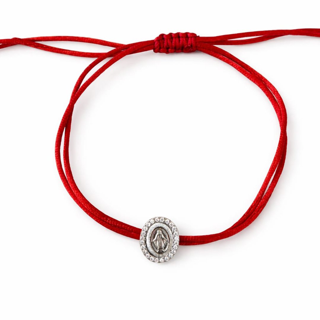 Shambala em fio de seda vermelho, pingente de Nossa Senhora em prata com cravação em Moissanites.