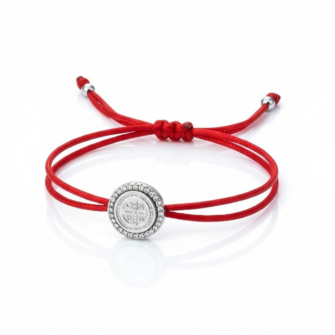 Shambala em fio de seda vermelho, pingente de São Bento em prata com cravação em Moissanites.
